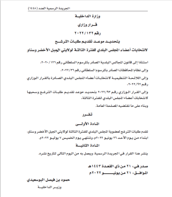 وهج الخليج- مسقط أصدر معالي السيد حمود بن فيصل البوسعيدي قرارا وزاريا بشأن تحديد موعد تقديم طلبات الترشح لانتخابات أعضاء المجلس البلدي للفترة الثالثة لولايتي الجبل الأخضر وسناو.