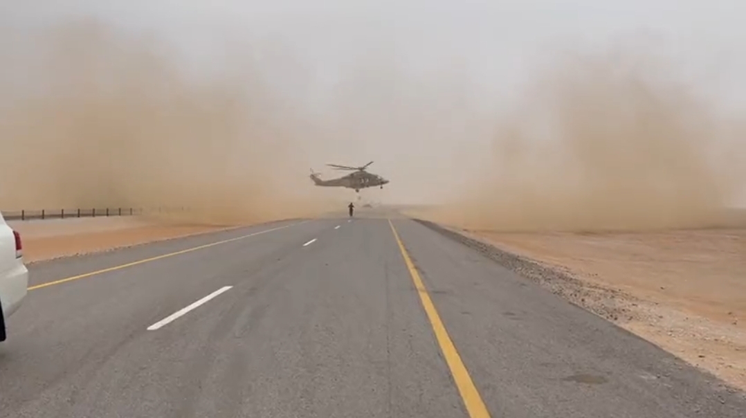 طيران الشرطة ينفذ عملية نقل مصاب إلى مستشفى نزوى المرجعي بعد حادث تدهور مركبة نتج عنه وفاة أربعة مواطنين وإصابة ثلاثة أخرين من أسرة واحدة بإصابات مختلفة على طريق أدم- هيما بالاتجاه إلى محافظة ظفار.