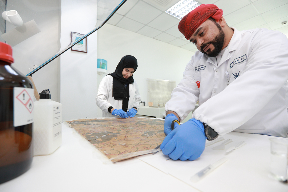 وحول مراحل الترميم والصيانة وعملية الترطيب الموضعي المُستخدمة في عملية الترميم يقول محمد بن حميد السليمي رئيس قسم الترميم بهيئة الوثائق والمحفوظات الوطنية: تتطلب تقنية الترطيب الموضعي للوثائق مهارة فنية ومعرفة دقيقة بالمكونات المادية للوثائق من أحبار وألوان وحركة خطوط ألياف الورقة الطولية والعرضية، وهي تقنية مبتكرة في قسم الترميم بهيئة الوثائق والمحفوظات الوطنية؛ لفك اللواصق الورقية المتلفة للوثائق، حيث قام الفنيون بتجزئة الخريطة إلى ثلاثة قطاعات ورقية وإضافة مادة “التايلوز”، وإطباق صفحة من مادة “البولي إيثيلين” على الواجهة الأمامية للخريطة، ومن ثم التخلُّص من الفقاعات المتكوِّنة بين الطبقتين نتيجة لمادة الترطيب، وبالتالي بدأت الخريطة تدريجيًّا في التفكك من الغراء اللاصق واللوح الخشبي والتماسك تلقائيًّا مع طبقة “البولي إيثيلين” طبقة الحماية المؤقتة لمنع أجزاء الخريطة من التبعثر الناتج عن ارتفاع مستويات الحموضة، مما ساعد على بقاء كافة تفاصيل الخريطة المكتوبة والمرسومة والحفاظ على ألوانها، كما أنّ عمليات التنظيف وإزالة البقع والتكلسات التي استُخدمت أثناء المعالجة ساعدت على إظهار الخريطة وتوضيح تفاصيلها، حيث تعامل معها المختصون كيميائيًّا باستخدام المشارط والقطن في مواضع كثيرة من الخريطة، وتمكّنوا من إزالة اللواصق البلاستيكية من سطح الخريطة، والحفاظ على كافة التفاصيل.