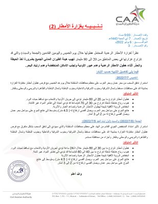 نظرا لغزارة الأمطار الرعدية المحتمل هطولها غدا الخميس ويومي الجمعة والسبت والتي قد تتراوح غزارتها في بعض المناطق من 20 إلى 80 مليمترًا تهيب هيئة الطيران المدني الجميع بضرورة أخذ الحيطة والحذر أثناء هطول الأمطار الرعدية وعدم عبور الأودية وتجنب الأماكن المنخفضة وعدم ارتياد البحر