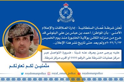 أعلنت شرطة عُمان السلطانية – إدارة العــــلاقــات والإعـــلام الأمنــي – بأن المواطن/ أحمد بن عباس بن علي البلوشي قد خرج من منزله الكائن بولاية الخابورة منذ يوم الخميس 23/ 6/ 2022م ولم يعد حتى تاريخ نشر هذا الإعلان.