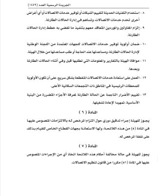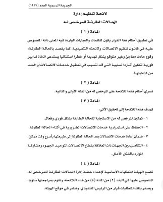 أصدرت هيئـة تنظيـم الاتصـالات قرارًا رقم 107/2022 بإصـدار لائحـة تنظيـم إدارة الحـالات الطارئـة للمرخص له.