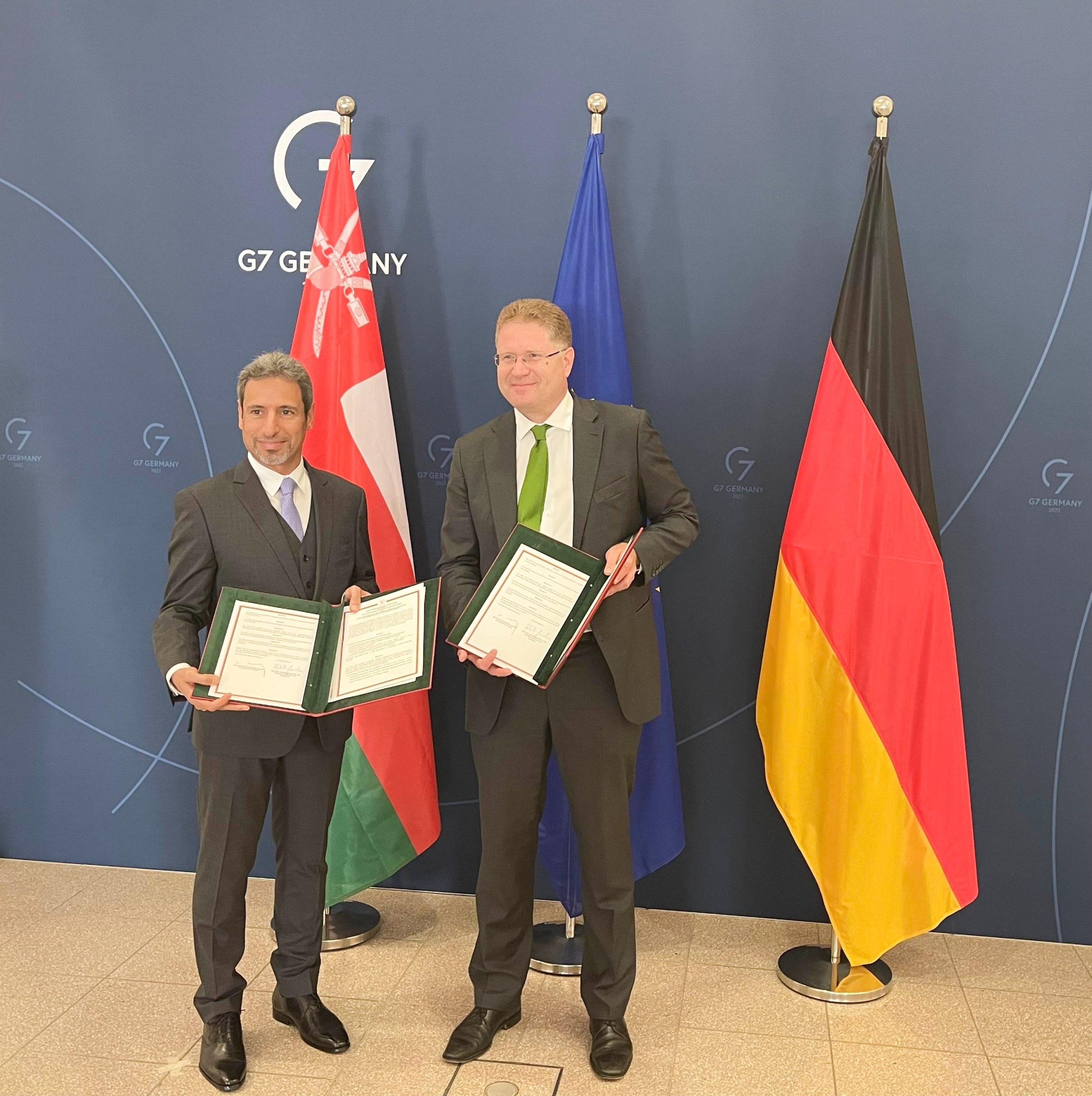 في اطار الزيارة الرسمية لحضرة صاحبِ الجلالة السلطان هيثم بن طارق المعظّم لجمهورية ألمانيا الاتحادية، وقع معالي المهندس سالم بن ناصر العوفي وزير الطاقة والمعادن، ومعالي الدكتور باتريك جرايشن وزير الدولة بوزارة الاقتصاد وحماية المناخ، إعلان النوايا المشتركة للتعاون في مجال الطاقة.