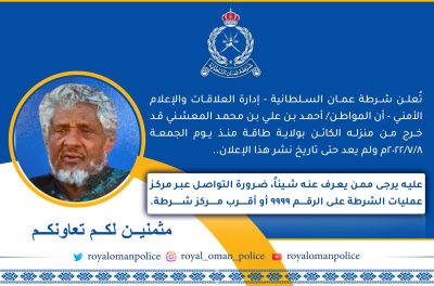 أعلنت شرطة عُمان السلطانية عن فقدان مواطن بعد خروجه من منزله الكائن بولاية طاقة بتاريخ الجمعة ٨/٧/ ٢٠٢٢م.