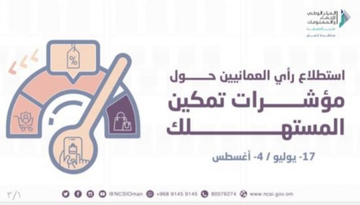 يبدأ المركز الوطني للإحصاء والمعلومات بالتعاون مع هيئة حماية المُستهلك تنفيذ استطلاع للرأي العام غدًا الأحد حول مؤشرات تمكين المُستهلك في سلطنة عُمان.