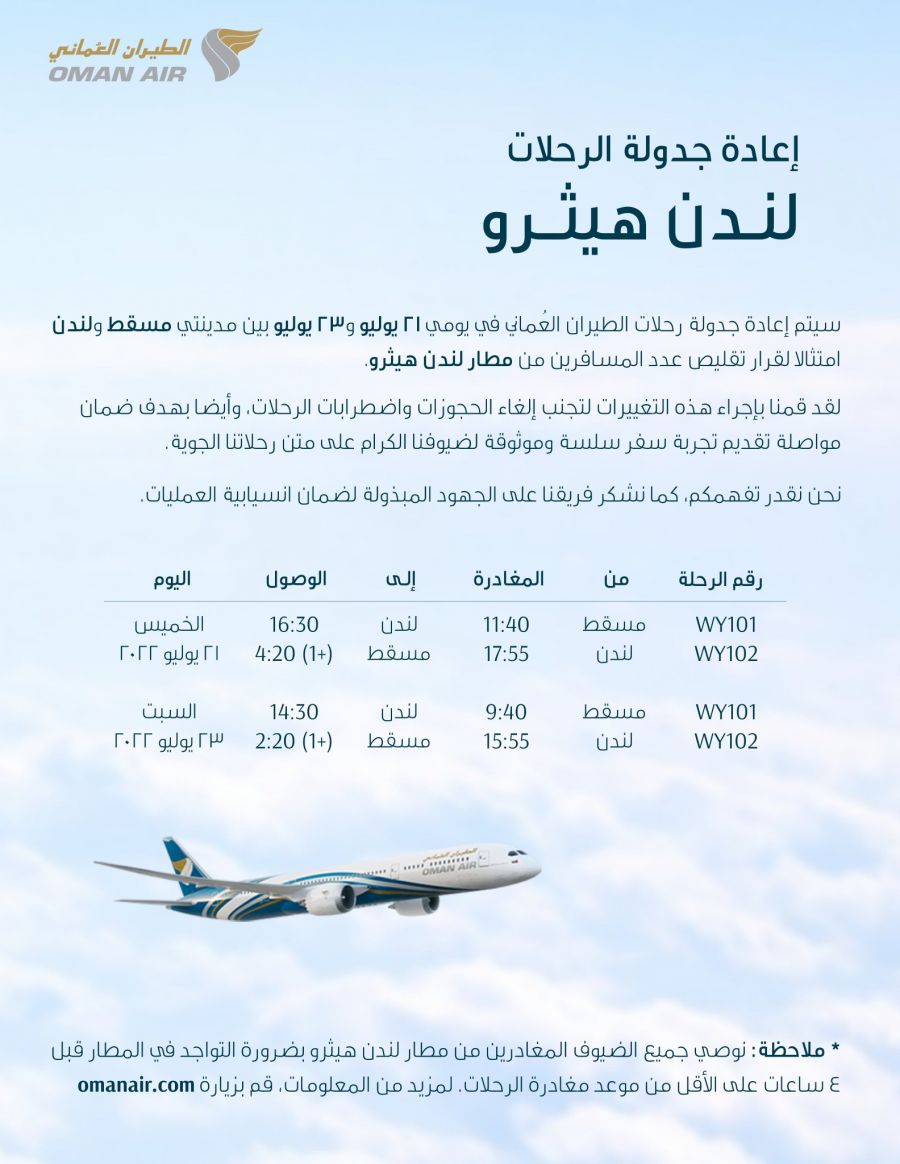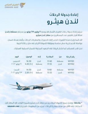 “الطيران العماني” يعيد جدولة بعض الرحلات بين مطار مسقط ومطار هيثرو لندن