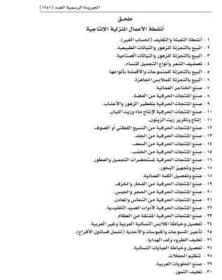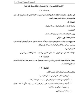 وقد نصت المادة الأولى من القرار بأن يعمل في شأن تنظيم مزاولة الأعمال الإنتاجية المنزلية بأحكام اللائحة المرفقة.