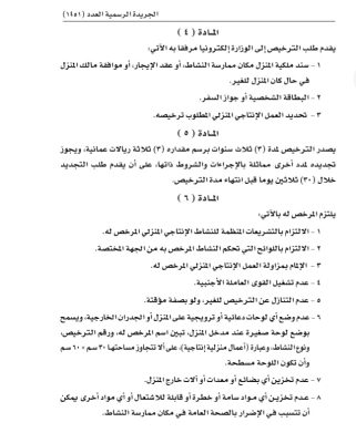 أما المادة الثانية فقد نصت على “يجب على كل من يزاول الأعمال الإنتاجية المنزلية توفيق أوضاعه طبقا لأحكام اللائحة المرفقة خلال (٦) ستة أشهر من تاريخ العمل بها”.