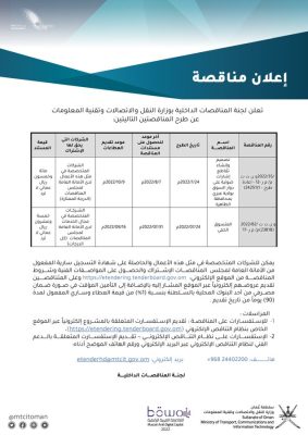 أعلنت لجنة المناقصات الداخلية بوزارة النقل والاتصالات وتقنية المعلومات عن طرح المناقصتين التاليتين: