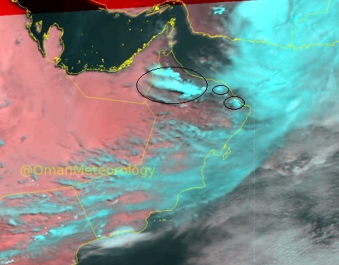 “- تشكل خلايا رعدية جنوب الشرقية(صور) وجنوب مسقط مع امتداد وتوسع الخلايا الرعدية على أجزاء من جنوب الباطنة والداخلية والظاهرة مع هطول أمطار متفاوتة الغزارة