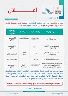 أعلنت وزارة العمل عن وجود وظائف شاغرة لدى منظمة الأمم المتحدة للتربية والعلوم والثقافة (اليونسكو) حسب البيانات المحددة للتسجيل عبر الرابط التالي :