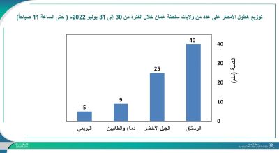 أوضحت وزارة الثروة الزراعية والسمكية وموارد المياه كميات توزيع هطول الأمطار على عدد من ولايات سلطنة عُمان خلال الفترة من 30 يوليو إلى 31 يوليو 2022م (حتى الساعة 11 صباحاً).