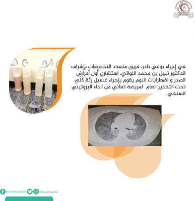 قام فريق متعدد التخصصات بالمستشفى السلطاني ، بإشراف الدكتور نبيل اللواتي ،استشاري أول أمراض الصدر واضطرابات النوم، في إجراء نوعي نادر ، بإجراء غسيل رئة كلي تحت التخدير العام لمريضة تعاني من الداء البروتيني السنخي.