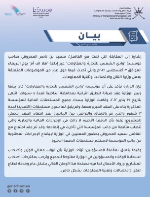 وزارة النقل والاتصالات وتقنية المعلومات تصدر بيان توضيحي على خلفية مقابلة المقاول سعيد المحروقي في إذاعة “هلا اف ام” والتي تحدث فيها حول عدد من الموضوعات المتعلقة بعمل الوزارة.