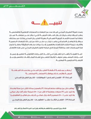 أصدرت هيئة الطيران المدني تنبيهًا بشأن المخالفات القانونية لنشر تنبؤات وتحذيرات تتعلق بالحالات الجوية التي تؤثر على سلطنة عمان خلافًا لما تصدره الأرصاد الجوية العُمانية.