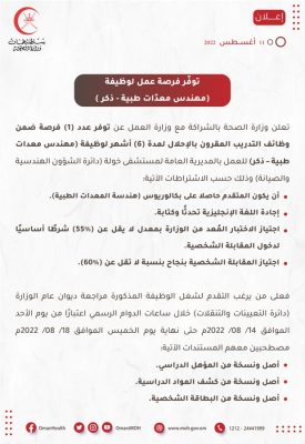 وهج الخليج - مسقط أعلنت وزارة الصحة بالشراكة مع وزارة العمل عن توفر عدد (1) فرصة لوظيفة (مهندس معدات طبية – ذكر) للعمل بالمديرية العامة لمستشفى خولة.