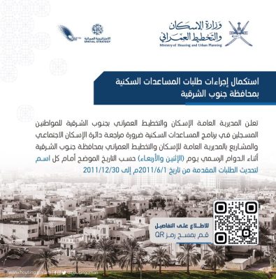 نشرت وزارة الإسكان والتخطيط العمراني إعلان للمسجلين في برنامج المساعدات السكنية بمحافظة جنوب الشرقية لمراجعة دائرة الإسكان الاجتماعي والمشاريع لتحديث بيانات الطلبات خلال الفترة المحددة.