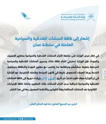 وهج الخليج - مسقط أصدرت وزارة التراث والسياحة إشعارًا إلى كافة المنشآت الفندقية والسياحية العاملة في سلطنة عُمان.