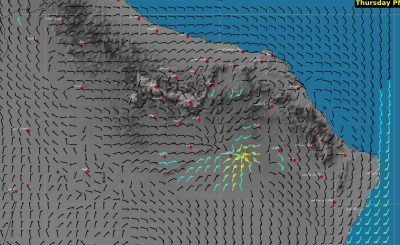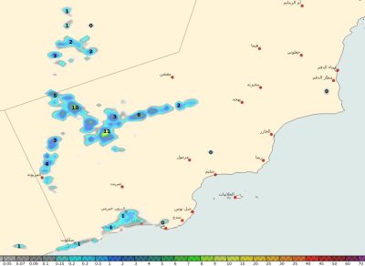 *مخرجات النماذج العددية العمانية لكميات الأمطار وأماكن الرياح الهابطة النشطة خلال الساعات القادمة.