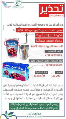 أصدر مركز سلامة وجودة الغذاء ما يفيد احتمالية تلوث بعض منتجات عصير كابري سن Capri Sun بنكهة الكرز إنتاج أمريكا من العلامة التجارية kraft Heinz ما يفيد تلوثها بمواد تنظيف كيميائية، التي تحمل الرقم التشغيلي 076840040900 لفترة الصلاحية إلى 25/6/2023.