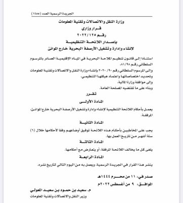 الرئيسية/أخبار محلية/إصدار اللائحة التنظيمية لإنشاء وإدارة وتشغيل الأرصفة البحرية خارج الموانىء أخبار محلية إصدار اللائحة التنظيمية لإنشاء وإدارة وتشغيل الأرصفة البحرية خارج الموانىء21/08/2022. 21/08/2022وهج الخليج- مسقطShare on:WhatsApp21/08/2022. 21/08/2022 فيسبوك X لينكدإن Tumblr بينتيريست Reddit VKontakte مشاركة عبر البريد طباعة