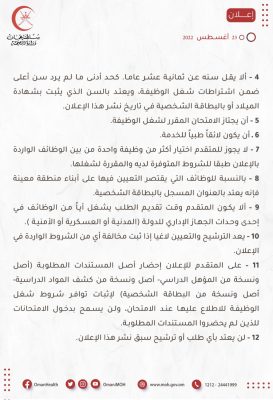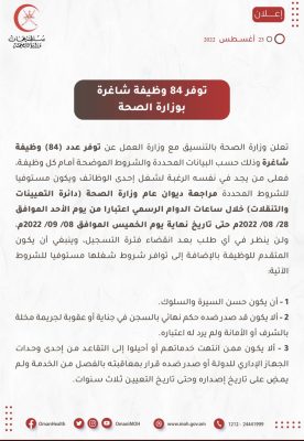 تعلن وزارة الصحة بالتنسيق مع وزارة العمل عن توفر عدد (84) وظيفة شـاغرة، فعلـى مـن يجـد فـي نفسـه الرغبـة لشـغل إحـدى الوظائـف ويكون مسـتوفيا للشروط المحددة مراجعة ديوان عام وزارة الصحة (دائرة التعيينات والتنقلات).