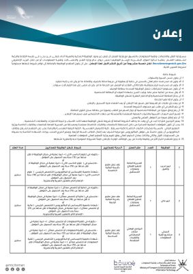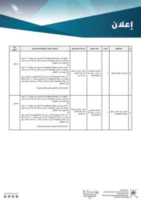 وهج الخليج- مسقط أعلنت وزارة النقل والاتصالات وتقنية المعلومات بالتنسيق مع وزارة العمل عن توفر عدد من الوظائف شاغرة للمزيد من التفاصيل عبر الإعلان التالي: