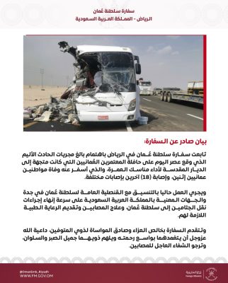 وهج الخليج - مسقط أصدرت سفارة سلطنة عُمان في الرياض بيانًا حول الحادث الذي وقع على حافلة المعتمرين العمانيين عصر اليوم.