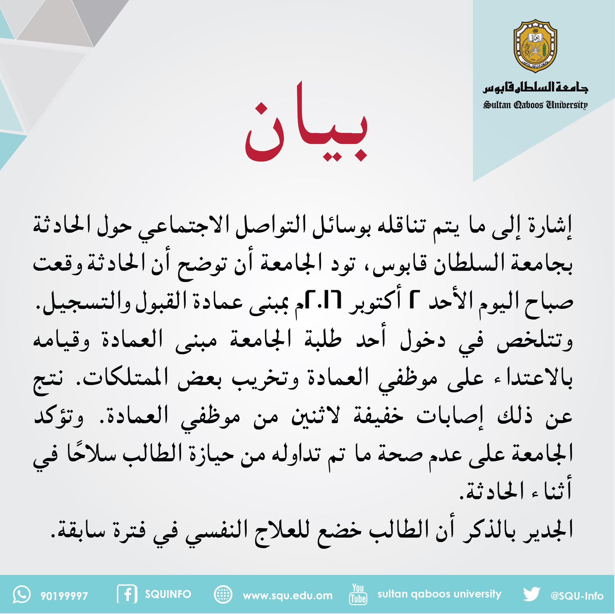 -  أخبار محليةصورة: بيان رسمي من #جامعة_السطان_قابوس بشأن حادثة الاعتداءأصدرت جامعة السلطان قابوس قبل قليل بيانا حيال حادثة الاعتداء التي وقعت صباح اليوم بعمادة القبول والتسجيل. ومتابعة للخبر الذي… أكمل القراءة »