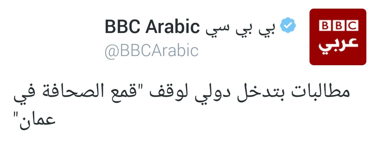 -  أخبار محليةردود فعل غاضبة على بيان BBC Arabic حول مطالبات بتدخل دولي على قضية الزمنأثار الخبر الذي نشرته “شبكة BBC Arabic الإخبارية” حول وجود مطالبات بتدخل دولي لوقف قمع الصحافة في سلطنة عُمان ردود… أكمل القراءة »